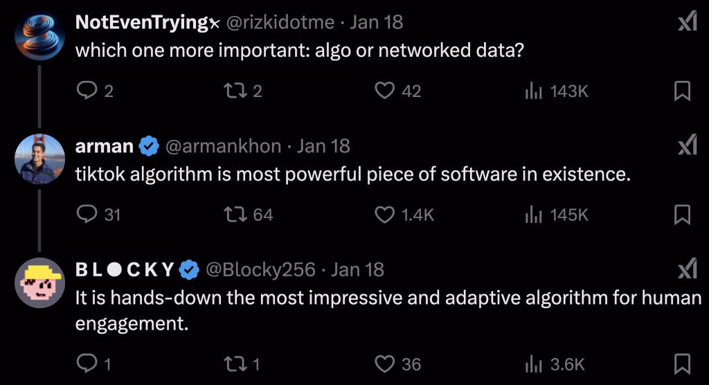 I also should point out a common misconception: the algorithm alone isn’t responsible for TikTok’s success. It is crucial but there’s an interplay between the algorithm and networked data.