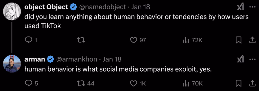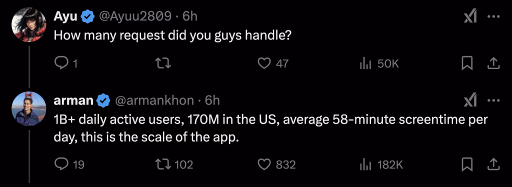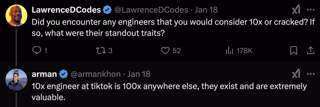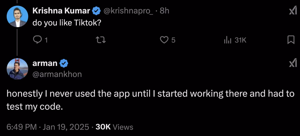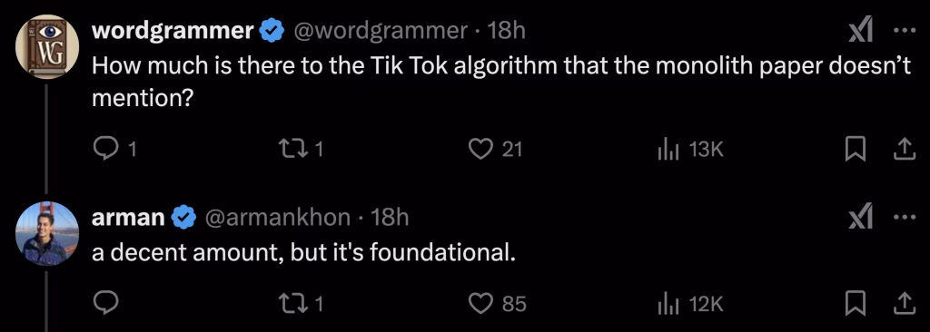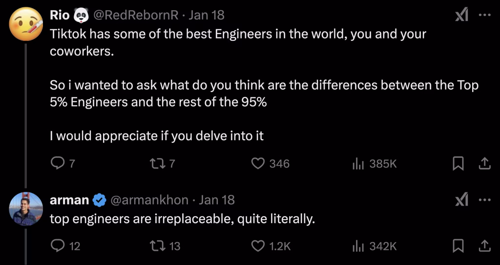 I really enjoyed the boldness with which Arman, who quit his $330k engineering job at TikTok, replied to great questions. Some people on X replied with sarcasm that the claims I’m going to show you were for engagement. Maybe. Maybe not.